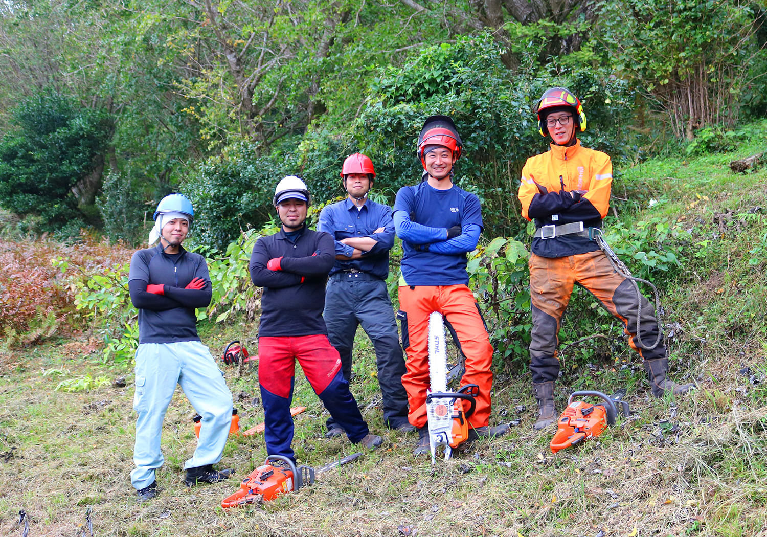 メンバーは、いつもは別々の会社などで働いている7名が職場の垣根を越えて集まり、交流を深めるとともに林業技術の向上に切磋琢磨しています。